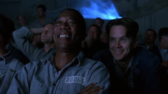 A scene from The Shawshank Redemption (1994), the prisoners spend an evening watching a movie.